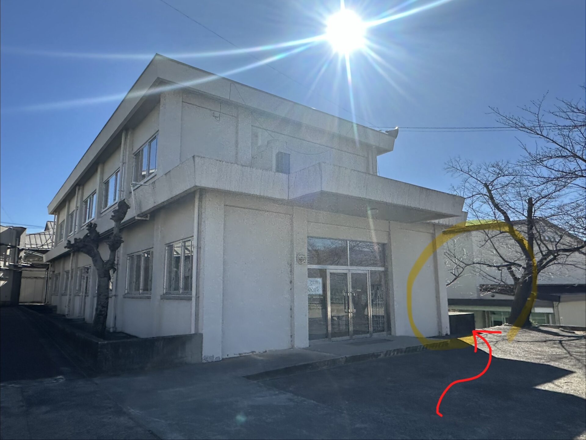 別館の玄関側から、体育館側にある通路(写真の赤い矢印の方向)を進んでお越しください。